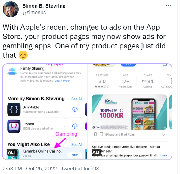 到了今年10月底,一批赌博类应用的广告,突然席卷整个 App Store。