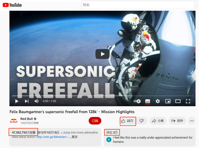 当时奥地利极限跳伞运动员为了挑战超音速,从几乎是太空的边缘位置(接近平流层),携带降落伞瞬间跳下,这一跳最高速度突破了音速,达到了1173km/h,最终平安落地,菲利克斯和他身上硕大的红牛Logo一并烙印在了粉丝的记忆里。