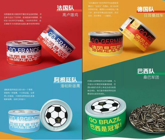 一个例子是三胖蛋瓜子在世界杯期间推出了新包装,挑选4个夺冠热门印在包装上:“法国是冠军!”“德国是冠军!”“阿根廷是冠军!”“巴西是冠军!”结果实体店刚摆出来,3万份产品全部售罄,毕竟谁都不愿意自己的主队输给老对手。