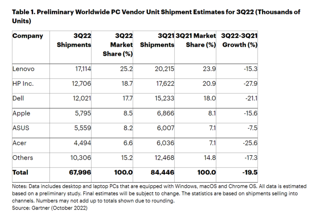2022年第三季度全球个人电脑(PC)出货量,图源Gartner