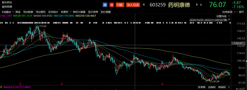 与亮眼的业绩相比,药明康德的股价表现却十分低迷。截至11月28日,药明康德收盘价报76.07元,距离去年高位171.63元,跌幅超过55%,市值蒸发了约2700亿。