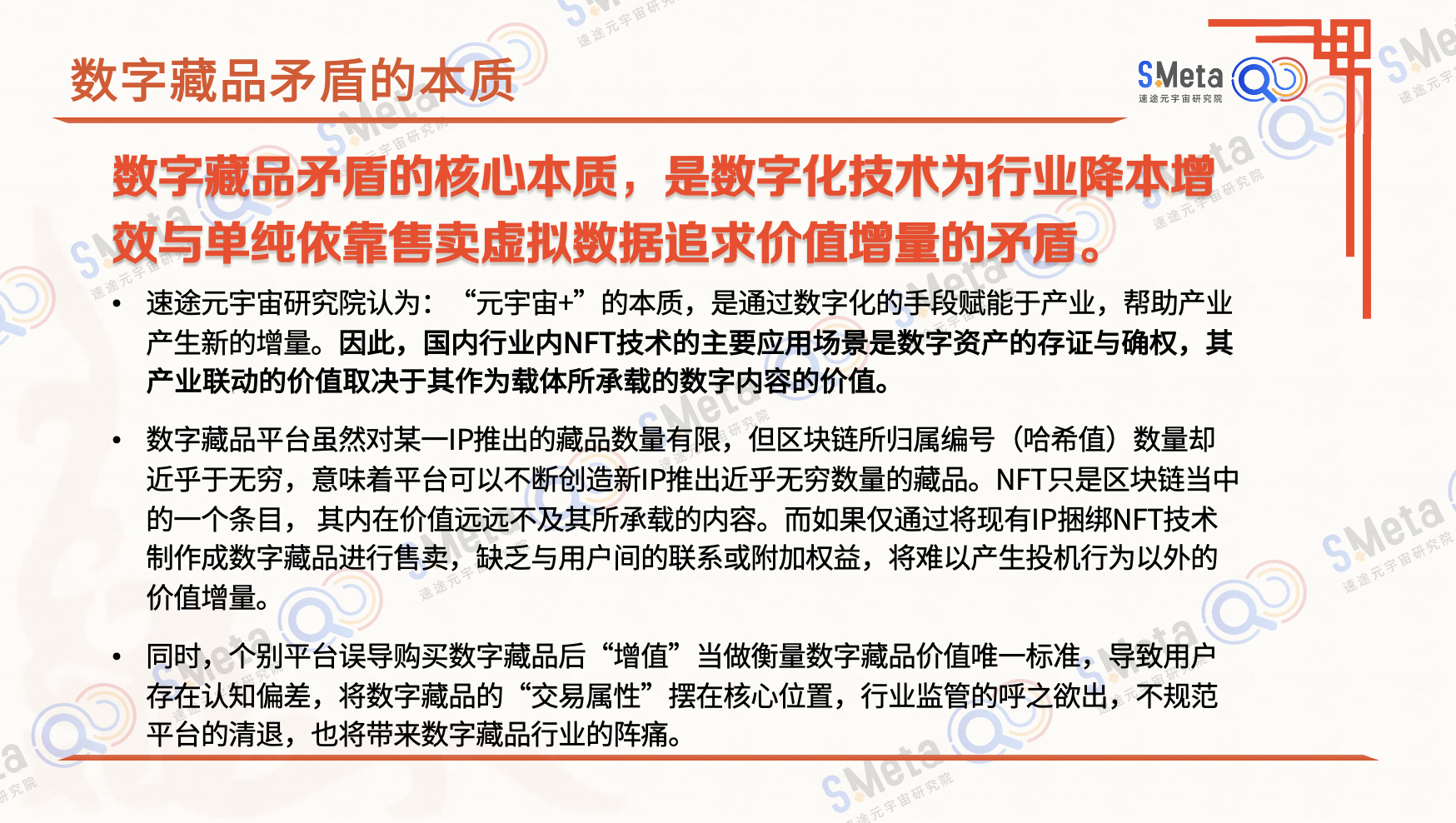 速途元宇宙研究院在《2022数字藏品产业研究报告》中,揭示了现阶段数字藏品矛盾的核心本质,即“数字化技术为行业降本增效,与单纯依靠售卖虚拟数据追求价值增量的矛盾”。