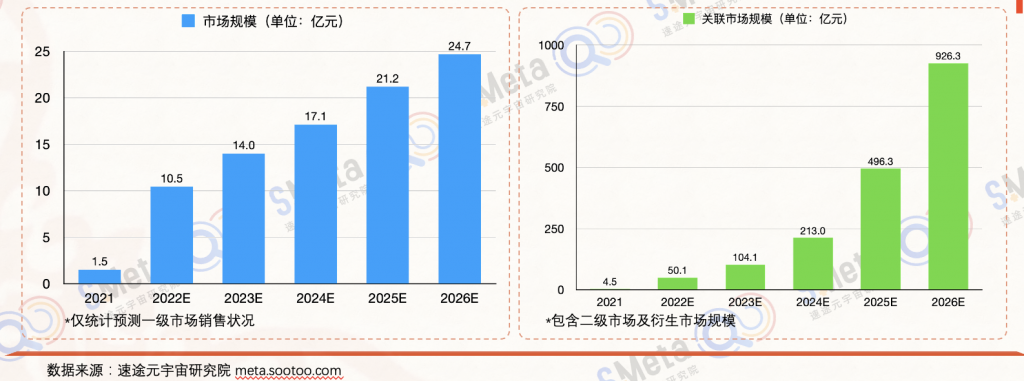 《2022数字藏品产业研究报告》中预测,至2026年末,国内数字藏品市场规模将达到24.7亿元,虽然总体规模有限,但将呈现出强劲的消费推动作用,关联市场规模将达到926.3亿元。