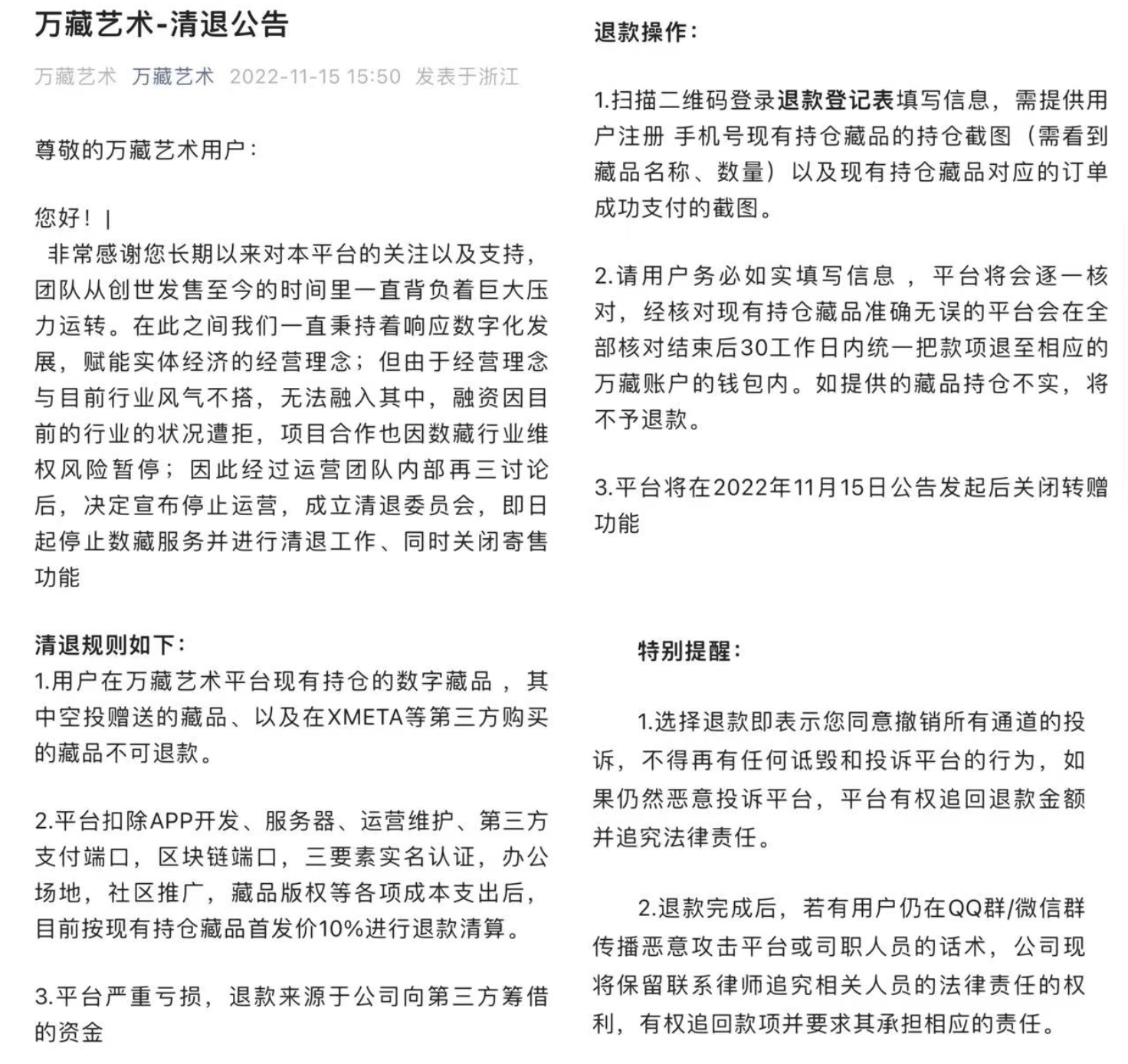 1、感谢藏家的陪伴,但平台持续亏损,最终无力经营;