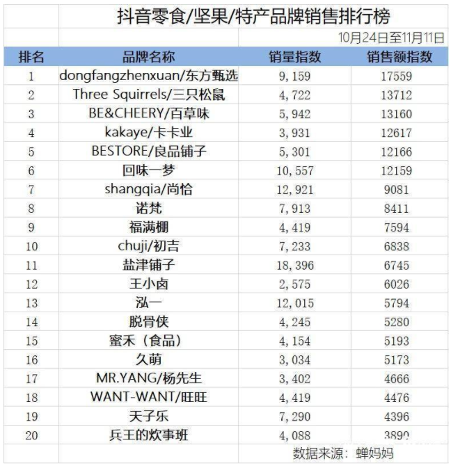 蝉妈妈数据显示,近一周抖音平台食品饮料品类商品按照销量排行,三只松鼠、良品铺子旗下商品未能进入前100名。