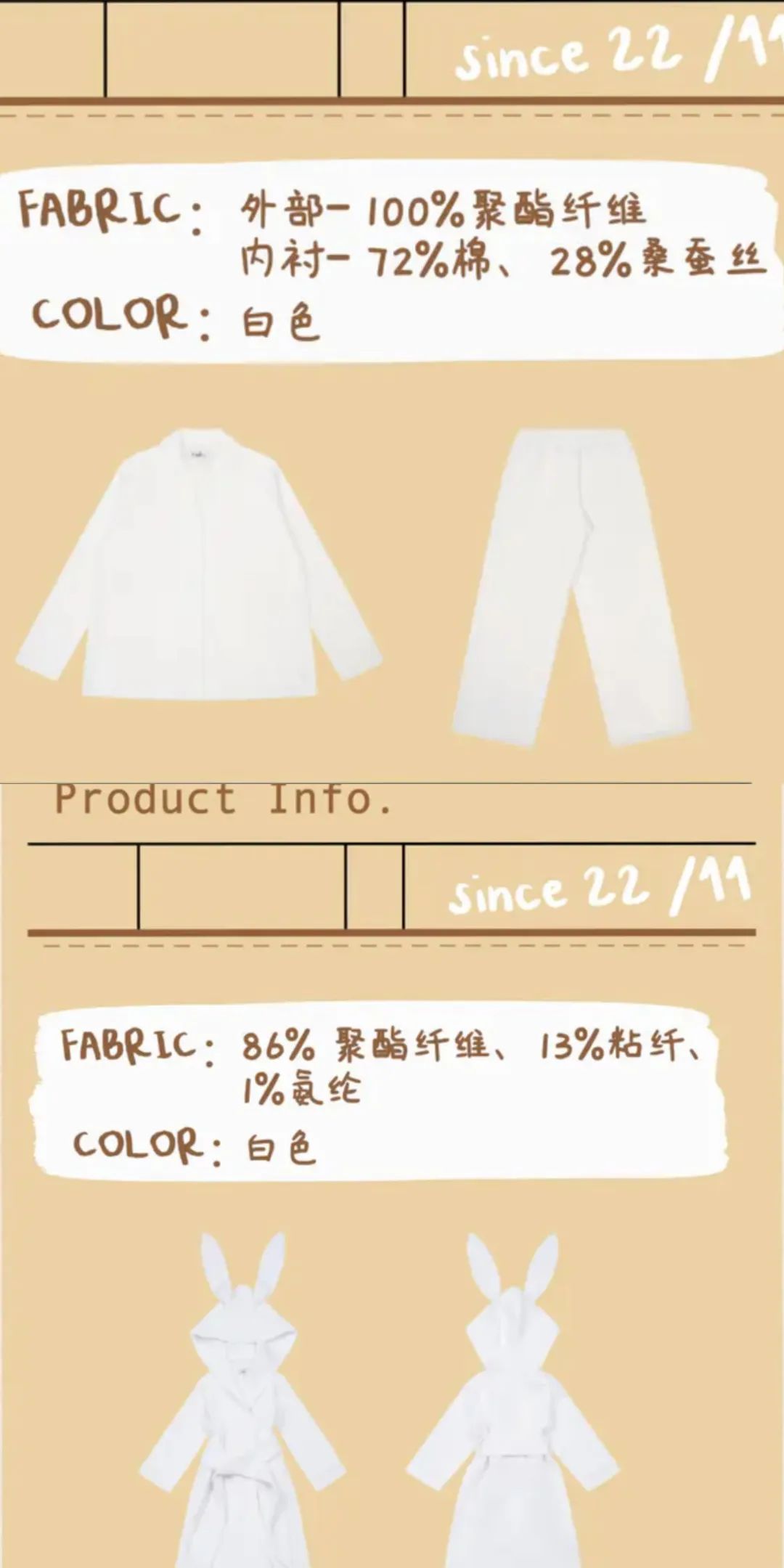 从材质来看,nabi产品多以聚酯纤维材质为主:睡衣套装外部面料显示为100%聚酯纤维,内衬则是72%棉和28%的桑蚕丝;浴袍面料显示为86%聚酯纤维、13%粘纤与1%氨纶。