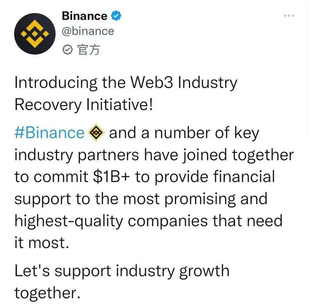 所谓行业复苏计划,是币安新牵头设立的,公告中称该计划“旨在支持FTX灾难性破产后陷入困境的行业参与者”。