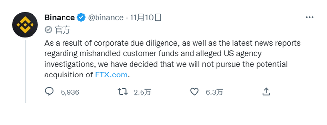但第二天,币安官方账号就在推特上表示,公司对FTX进行了更深入的考察,决定不再推进收购。