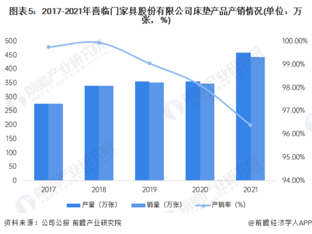 不过,喜临门也有忧虑。2017-2021年,喜临门床垫产销量整体呈增长趋势。但产销率在2018-2021年逐年下降。可以看出,喜临门有供过于求、库存增长的迹象。