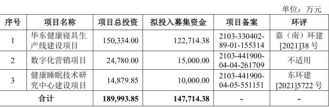 比如上市后的慕思,计划募集资金14.77亿元,其中12.27亿元用于华东健康寝具生产线,1.5亿元用于数字化营销项目,1.49亿元用于健康睡眠技术研究中心建设项目。