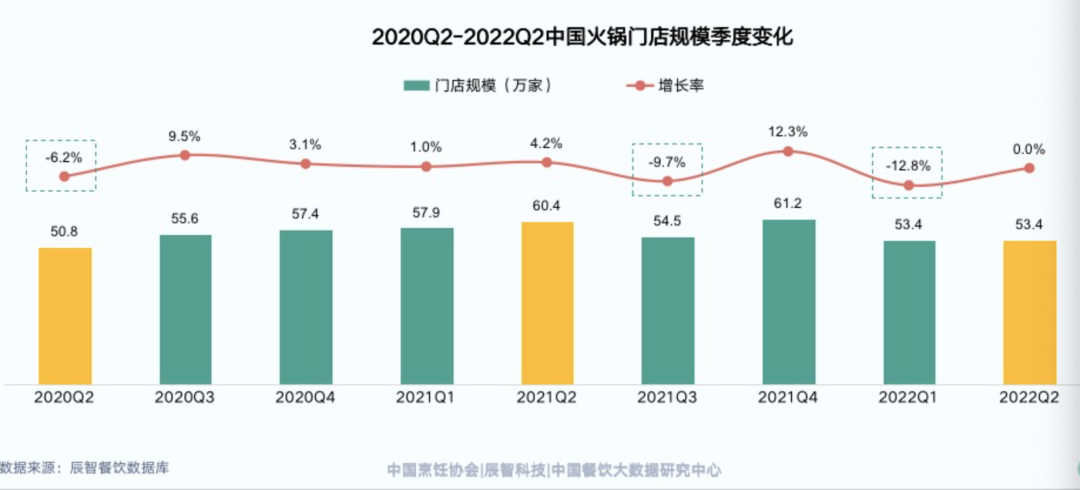 前述火锅大会发布的《2022中国火锅产业发展大数据分析报告》(以下简称:数据报告)提及:2020年上半年疫情冲击下、火锅业门店规模大幅萎缩,下半年至2021年虽有波折但整体呈复苏态势;然而,进入2022年疫情再袭,火锅业再次受创,受创程度甚至超过2020年,Q1门店规模减少超10%,Q2完全无复苏迹象。截至2022Q2,全国火锅门店规模约为53.4万家。