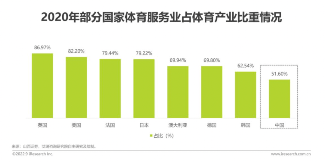 当然,这一数据相比国外成熟市场,还有巨大的差距。近期艾瑞咨询发布的《2022年中国体育赛事IP商业化研究报告》显示,中国与其他国家在体育服务业(包括转播、赞助、IP衍生品等)上差距不小,2020年英美两国的体育服务业占体育产业比重均超过80%,而中国仅为51.6%,且其中绝大多数都来自转播权和赞助。