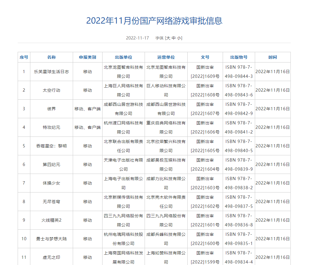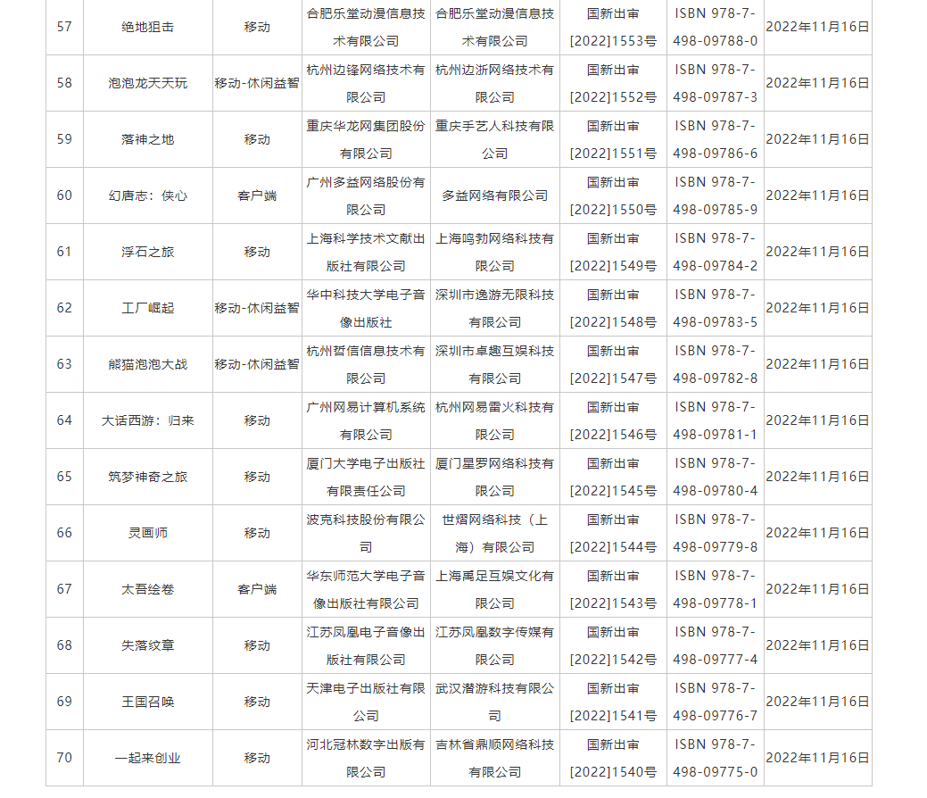 据GameRes游资网统计,整个11月开测的手游共有109款,数量虽多,其中有多少在正式上线后能转换为市场收入还是未知数。今年国产游戏缺乏爆款和版号收紧不无关系,好在11月下发了新一轮版号,共有70款游戏通过审批,包括2款客户端游戏,5款“移动+客户端”游戏,63款移动游戏。