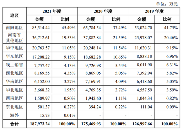 从地域来看,想念食品过于依赖当地市场。报告期内,想念食品在南阳地区的营收占比为41.75%、37.49%及45.49%,在河南省的营收占比分别为62.21%、59.08%和65.02%。但河南之外的省市占比较少,如西北、华南、华北、西南和东北地区,营收占比均没有超过5%。