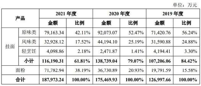 从营收结构来看,想念食品的产品主要是挂面和面粉,其中挂面在报告期内的营收分别为10.72亿元、13.87亿元和11.62亿元,占比为84.42%、79.07%和61.81%;面粉业务这几年发展较快,报告期内,面粉营收分别为1.97亿元、3.67亿元和7.17亿元,连续2年增幅近100%。