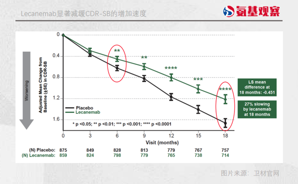 在接受治疗6个月后,lecanemab组与安慰剂组的CDR-SB评分出现统计显著的差别,在接受治疗18个月后,lecanemab组的CDR-SB评分的增加了1.21分,而安慰剂组评分增加了1.66分,两组之间的差异为0.45分,具有统计学意义。