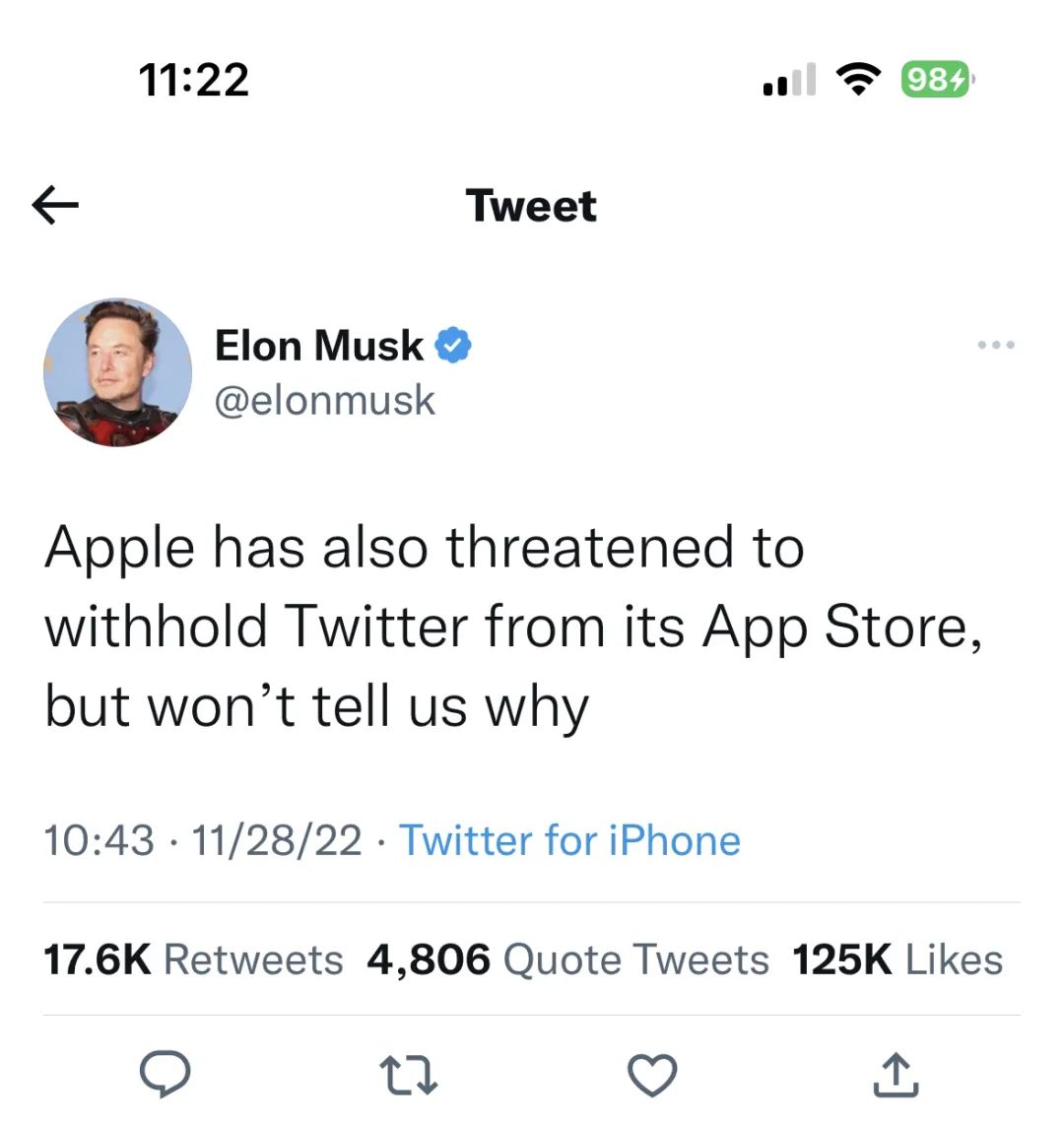 如果说此前马斯克只是因为苹果秘密造车,而对这个潜在竞争对手表达不屑的话,那么在收购推特之后,马斯克就不得不面对前所未有的尴尬境地:他的社交媒体平台,在诸多方面都严重受制于库克的苹果。