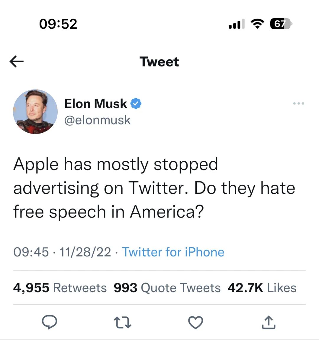 本周一,马斯克突然情绪激动地连发数条推文声讨苹果。他先是质问,“苹果已经基本停止在推特投放广告,他们是憎恨美国的言论自由吗?”马斯克还@了库克,要求对方给出解释。当然,他很清楚库克是不可能作出回应的。但现在马斯克已经将推特和自己作为美国言论自由的象征。