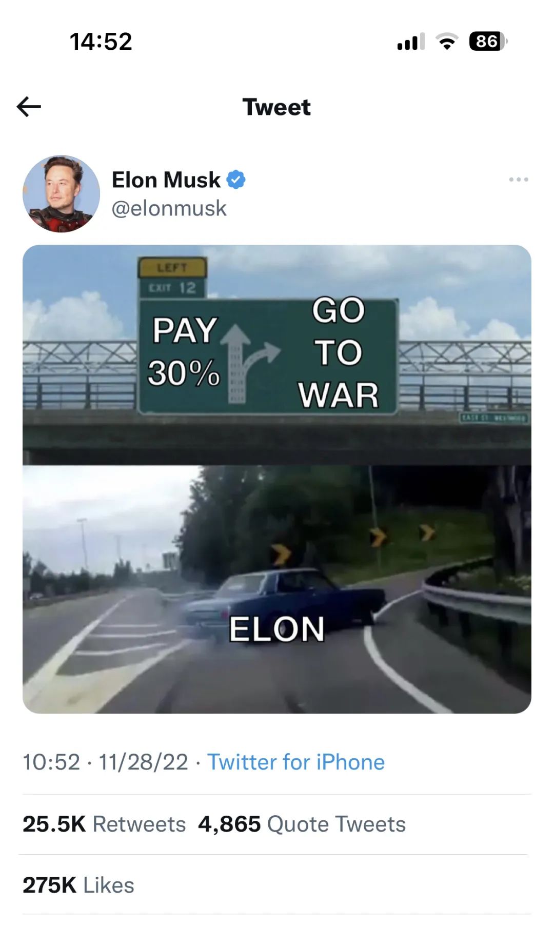 令人印象深刻的是,马斯克还发布了一张网络Memo图,在高速公路上行驶的汽车,前行方向写着“向苹果支付30%抽成”,右转方向写着“向苹果宣战”,他的意图很明显,自己计划和苹果开战。不过,他不知何时又悄悄删掉了这张图。究竟是在与库克会面之前还是之后删除的,就不得而知了。