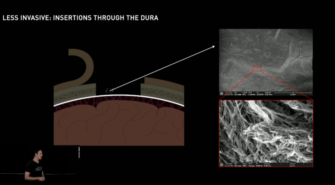 开发了无需在脑膜 (dura) 上开创,直接在脑膜外进行电极植入的机器人手术技术(在脑膜上开创会导致恢复过程中生成大量组织,覆盖包裹住接口设备,容易带来感染隐患,并且非常不便于后期设备维护)
