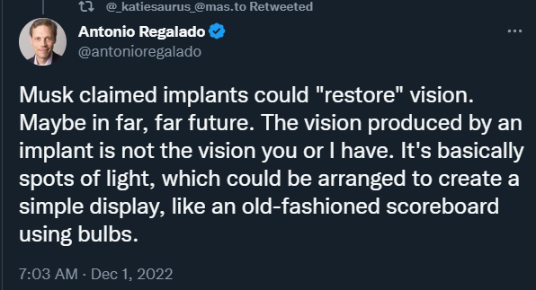 “马斯克宣称义体能够‘恢复’视觉——也许在很久以后的未来才能实现。能够通过义体产生的视觉并不是你和我所拥有的视觉。它更像是点状的光斑,也许能够通过组合的方式来形成一种简单的显示效果,就像老式的灯泡记分牌那样。”