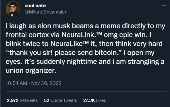 “我笑了,因为伊隆·马斯克通过NeuraLink.™直接将一个表情包发送到我的前颅皮层。哦,我的天啊,这太棒了。我眨了两次眼睛,用NeuraLike™赞了它,然后非常认真地想:“谢谢先生!请发送比特币。”我睁开眼睛,突然发现天已经黑了,而我正在掐着一个人的脖子。”