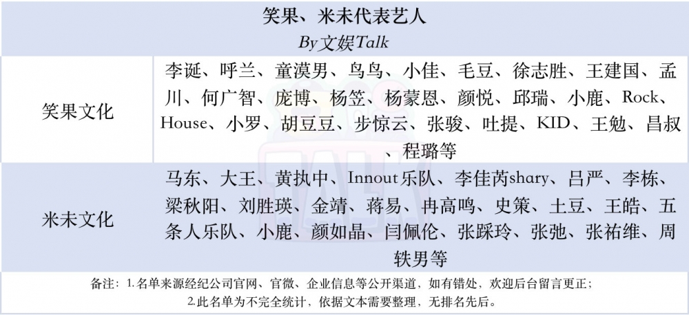 特别值得一提的是笑果、米未两家综艺内容公司的突围。在七季《奇葩说》、五季《脱口秀大会》、两季《一年一度喜剧大赛》、以及《乐队的夏天》的积累后,两家公司的艺人储备逐渐壮大起来。