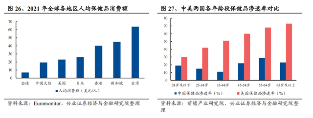 据欧睿数据,2021年中国保健品市场规模达到3289亿元,2011-2021 年 CAGR为9.45%,预计2026年达到约5178亿元,且对比海外,中国大陆人均保健品消费额只有19.42 美元,全面低于美日等发达国家,不足中国香港的1/2、不足中国台湾的 1/3,长期渗透率提升空间较大。