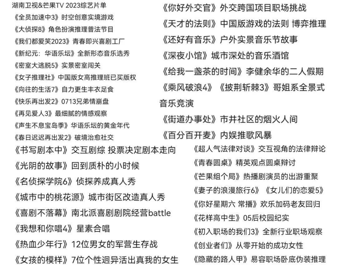 市场表现是行业生产的“晴雨表”,最近有一份网传的湖南卫视&芒果TV冬季招商会新综片单在微博上被热议,暴露了群众对于爆款综艺的迫切需求。倘若2022注定被失望填满,2023能否成为国综起势的转折之年呢?