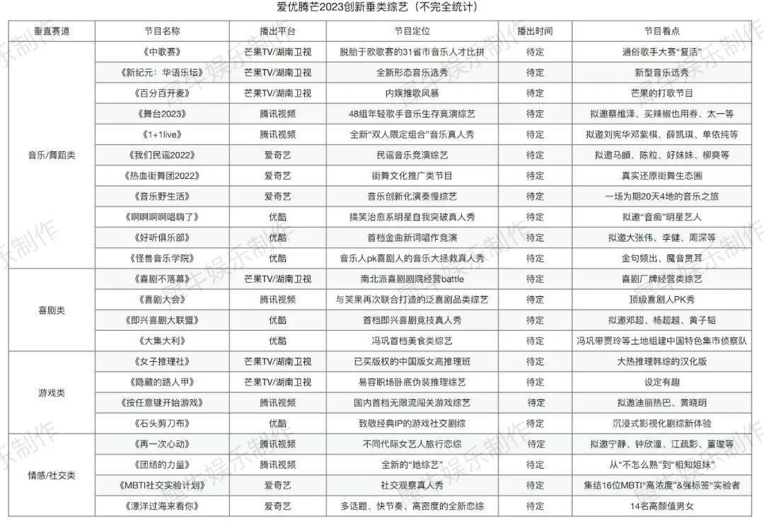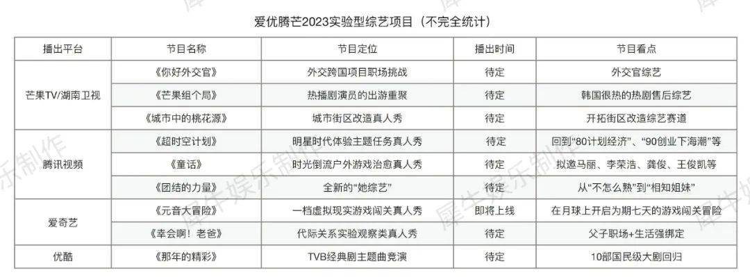结合这份网传片单,以及不久前腾讯综艺招商会、爱奇艺2022-23快乐专列和优酷云赏会透露出的相关片单,犀牛君梳理了各平台值得关注的2023新综项目(以及延播的部分2022综艺项目)。2023的国综市场能否等来“救市主”,我们一同来拆解。