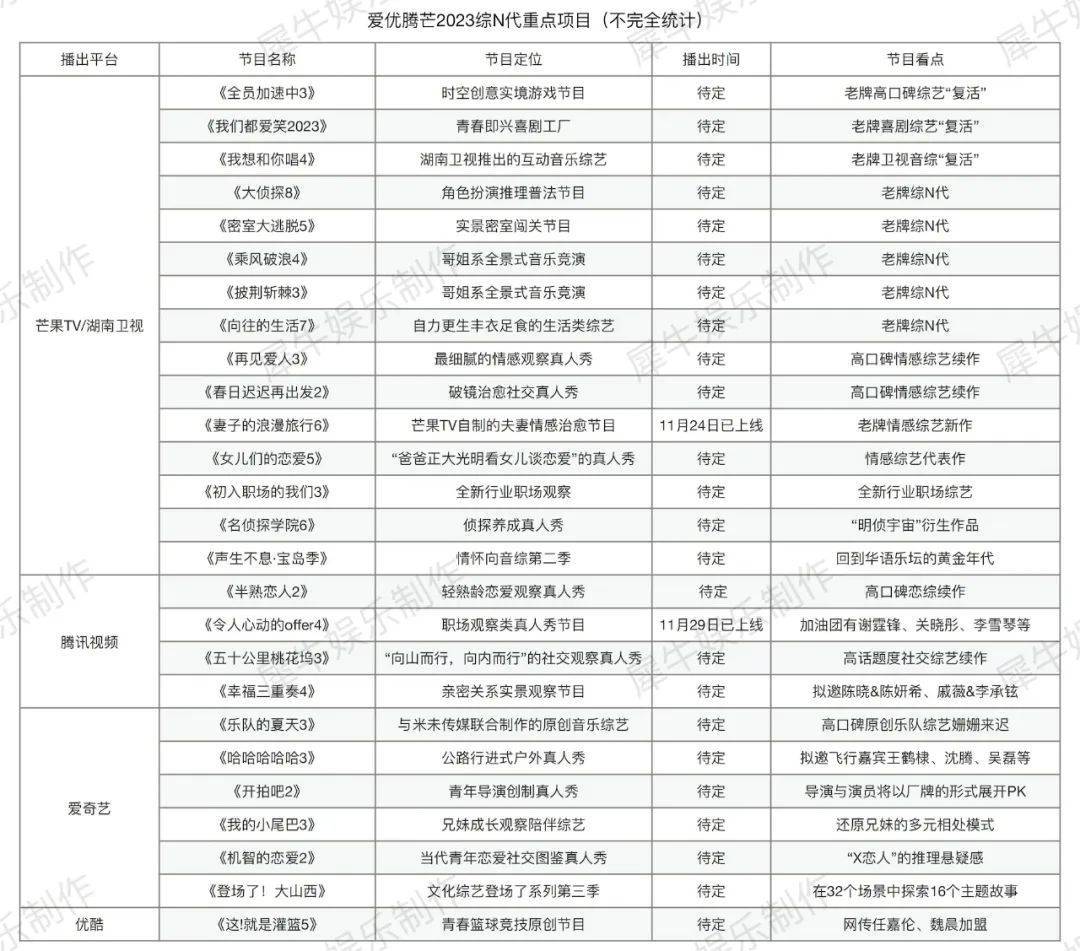 经此盘点下来,犀牛君似乎从中看到了很多2022综艺项目的影子,而鉴于今年的综艺项目很多都遭遇“仅片单见”的中途夭折,犀牛君对于这些2023新综项目的前景抱着一丝担忧的情绪。