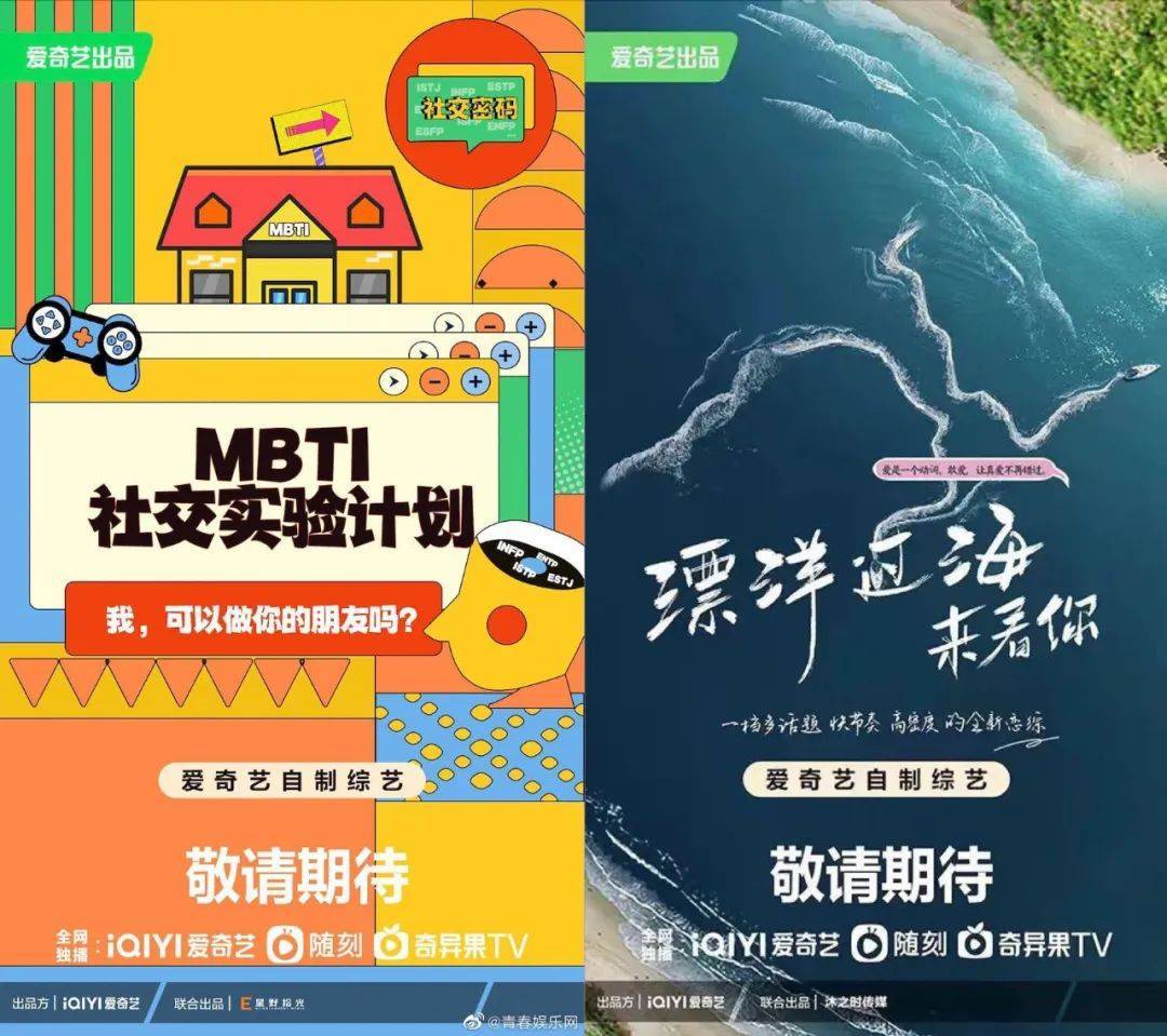 爱奇艺则在情感、社交两方面都做出了创新尝试,《MBTI社交实验计划》将集结16位“MBTI高浓度&强标签实验者”进行社交实验,《漂洋过海来看你》则把打造多话题、快节奏、高密度的恋综视为目标,希望打破观众对恋综的传统认知。