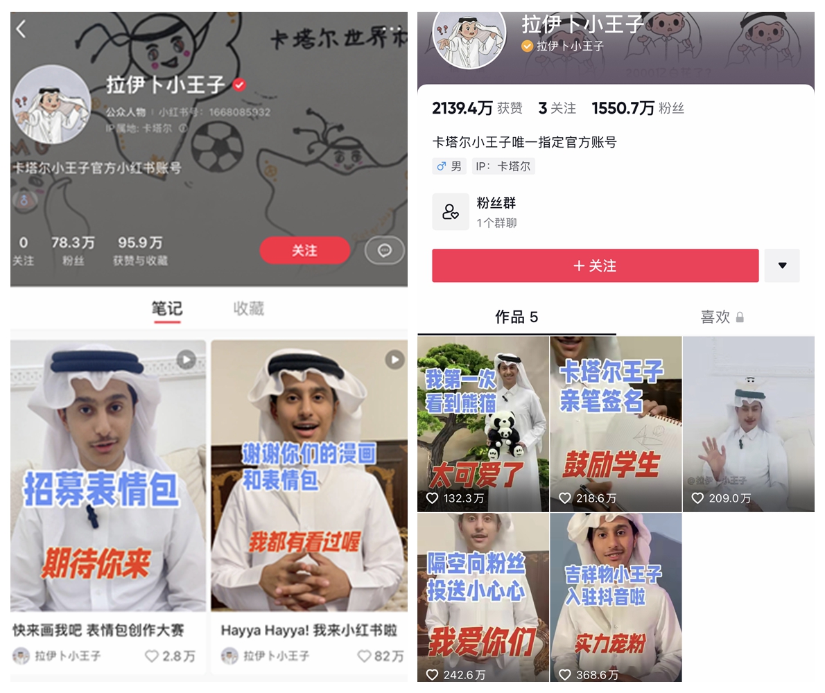 齐达内小红书账号目前粉丝2.8万,热度最高的是因形似吉祥物而走红的卡塔尔小王子,粉丝78.3万。搜索相关关键词可见,邀请小王子本人拍摄或偶遇小王子的视频点赞量几万到几十万不等,平台热度排行靠前。而很多人知道,小王子在入驻小红书3天前既已以相同昵称“拉伊卜小王子”入驻了抖音,短短数日,粉丝暴增至1550万,且时下仍在攀升,其发布的首条短视频,截至海克财经本文发稿,点赞量已逾368万。