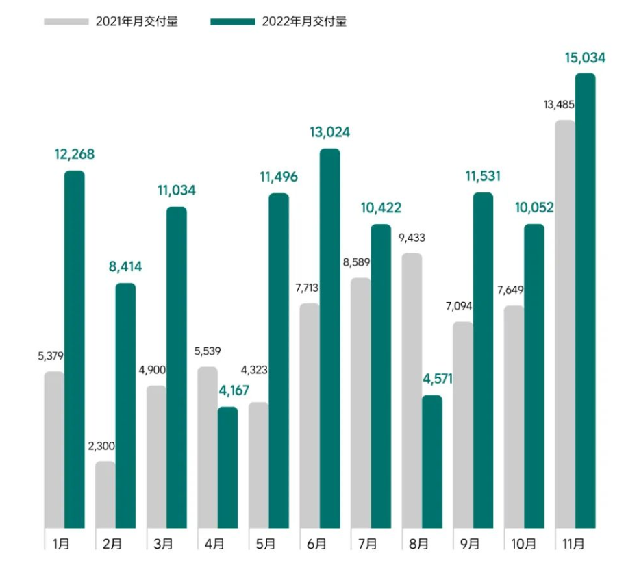 先说理想,数据显示,今年11月,理想汽车交付达到15034辆,较去年同期增长11.5%,环比上个月大涨50%。同时,这也是理想自开启交付以来,月度交付数据最高的一次。