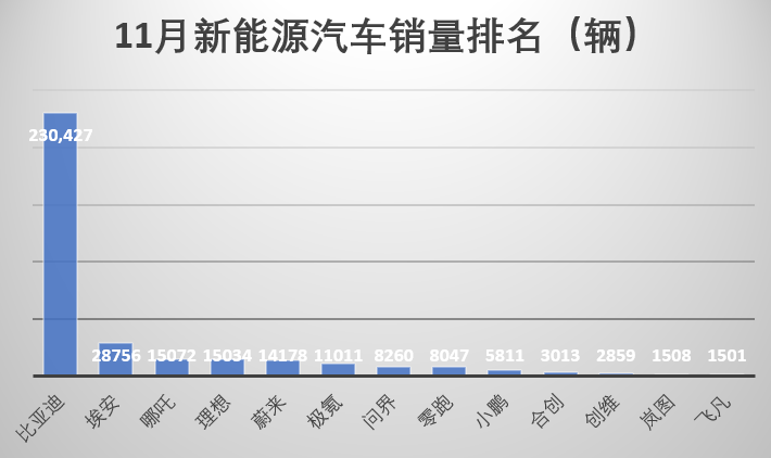 11月国内主流车企,新能源汽车销量排名如下: