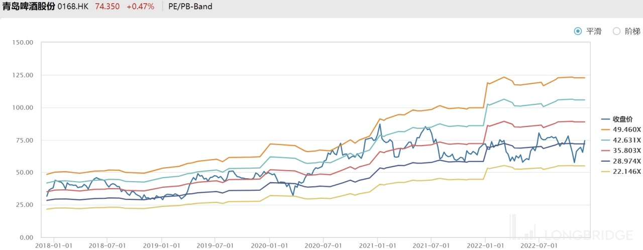 2)而从 PE 的角度看来看,青啤 2023 年的前瞻市盈率为 30%,从过往 PE 波动空间来看,也仍是中间偏下的状态,尚未回到平均区间。