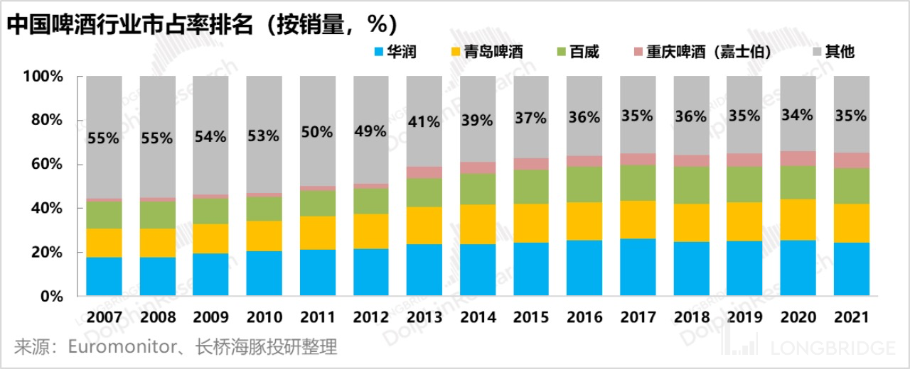(3)2018 年以来,当龙头市占率提升速度明显放缓,大鱼吃小鱼的红利基本结束。当年以华润收购高端品牌喜力为标志,行业彻底进入了有渠道、规模和资金优势的龙头强力并购整合,彻底走高端化的路径,行业竞争明确从 “吨量” 竞争转入 “吨价竞争”。
