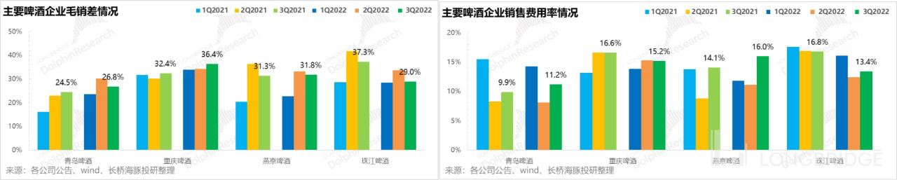 而且,由于近期啤酒公司大多把运输费用从销售费用项调到了成本项中,而且高端化一般对应着更高的营销投入,因此我们在考虑实际有效的毛利率时,更看重毛利率去掉销售费用率之后的毛销差。