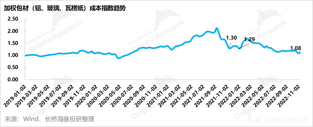 而如果往后展望的话,毛利率上如果以 2021 年底为基点,下半年美国猛加息后,海豚君基于铝、玻璃、瓦楞纸在包材成本的占比权重粗估出来的整体包材成本下行了差不多 20%。