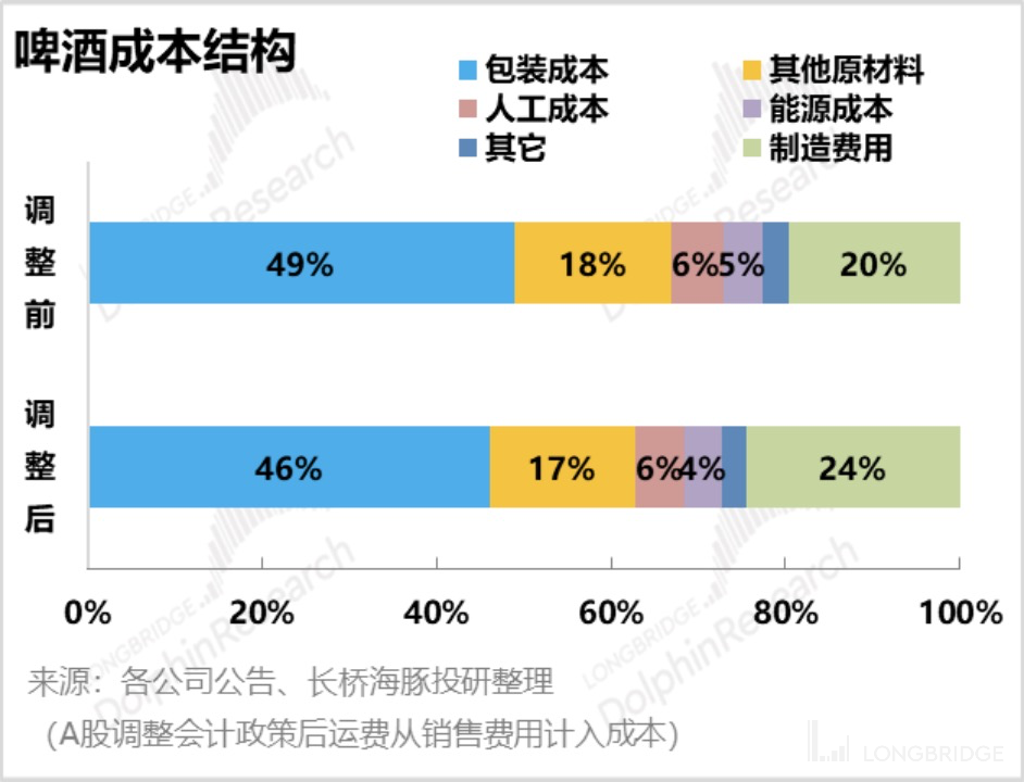 不同于价格竞争的以量取胜,啤酒这种成本以包材为主、而且相对高毛利的快销品,迈入高端化的吨价上涨时代,涨价就是其实就是利润释放,因为啤酒行业中,成本主要集中在包材(铝、玻璃、瓦楞纸等,占比接近 50%),而高端、低端其实差距更多是在于口味,好不好喝,包装上是没有太大差距的。
