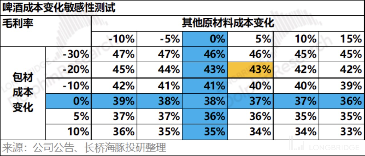 海豚君测算了包材成本下行带来的毛利率弹性:如果是完全市场化的采购,在去年到现在包材成本已经下降接近 20% 的情况下,毛利率理论的上行空间有希望从 38% 上行到 43% 左右,至少五个百分点的利润释放空间,考虑到实际上各家有采购周期和锁价控风险等情况,海豚君倾向于接下来的至少半年左右,成本下降至少能够提升啤酒公司大约 2-3 个百分点毛利率。