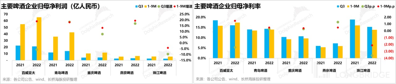 由于成本端前三季度还未看到明显回落,加上三季度疫情缓解之后价格品牌销售费用投入的影响,目前几家啤酒企业的归母净利率改善并不算特别明显。从结果上来看,百威亚太表现最差,青啤最好,重啤也算还行。
