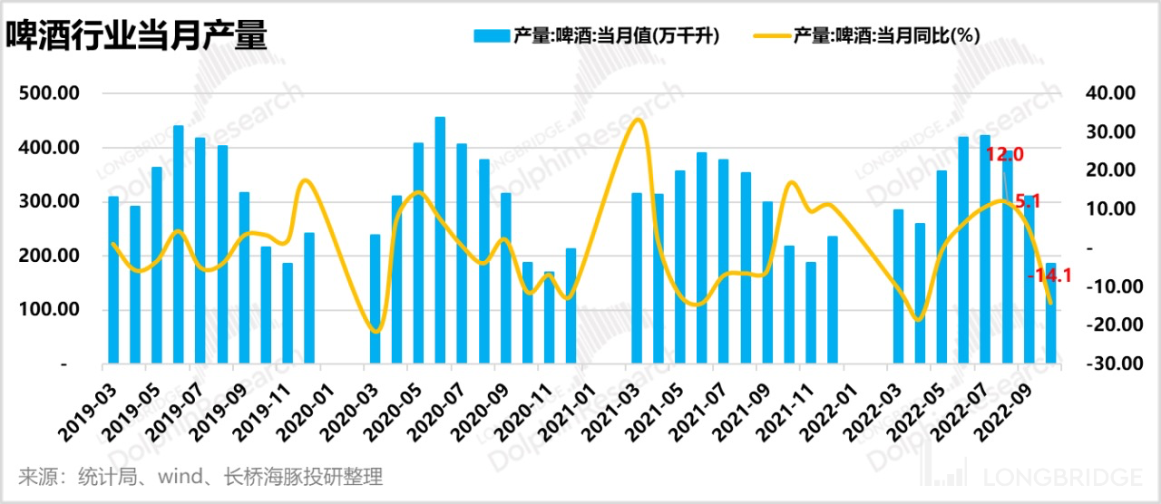 今年前十月啤酒产量相比 2021 年基本零增长,所以行业量的维度上仍然是停滞状态,而且前十个月拉平的销量主要也是靠 “天” 而来:今年夏天由于天气高热持续时间太长带来,从 7-8 月份产量基本上还在 11-12%,进入十月产量下滑其实比较大。