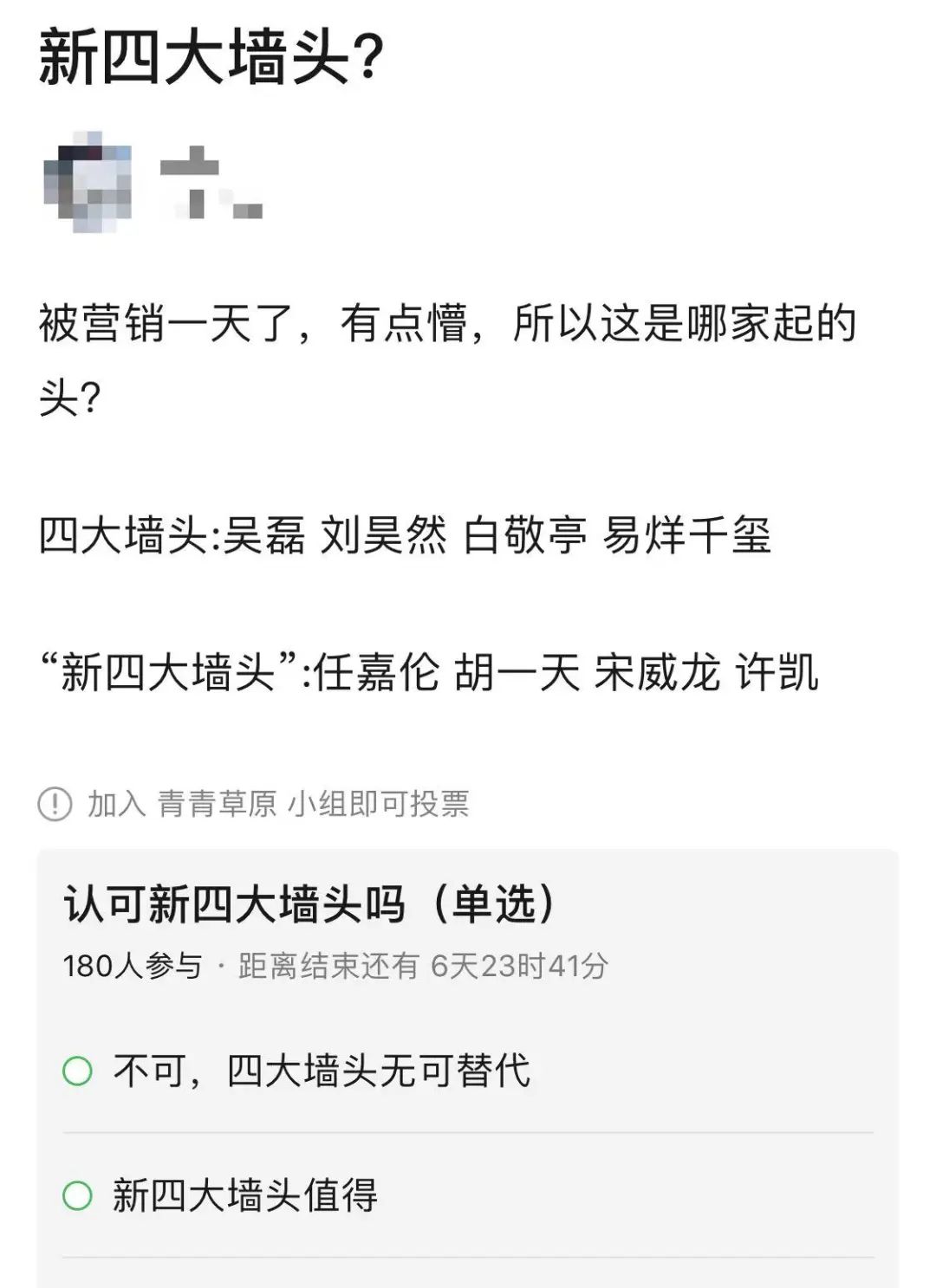 观众对“墙头”热情不减,早在两年前就拉扯出了“新四大墙头”宋威龙、任嘉伦、许凯、胡一天。只是这届墙头评选质疑声更多,粉丝的反馈也很冷淡,纷纷“抱走不约”,对“墙头”的爱称也敬谢不敏。