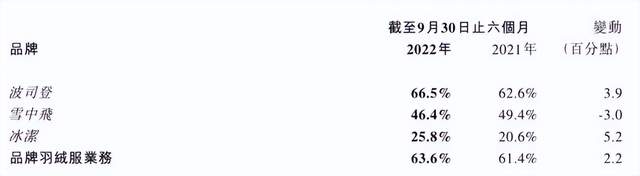 近日波司登发布的截至2022年9月30日止6个月中期业绩表示,高单价产品销售占比提升,波司登品牌毛利率提升,带动了羽绒服板块整体毛利率的提升。