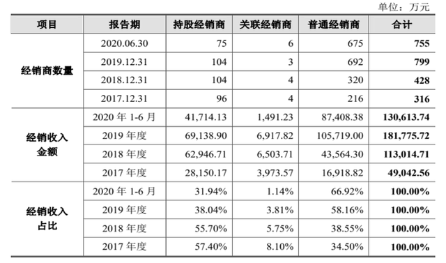 另外,国台酒业104家经销商持股比例为25.96%,在2017年—2019年,持股经销商加关联经销商占到经销收入的65.5%、61.45%、41.85%,截至2020年上半年,两者合计占比仍高达33.08%。
