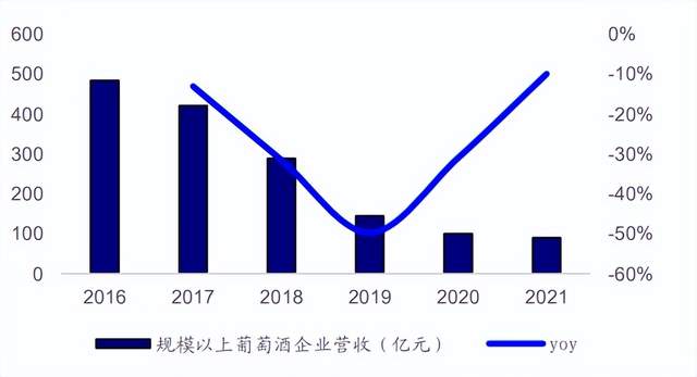 同时,2021年规模以上葡萄酒企业营收为90.3亿元,较2016年减少81.4%,期间CAGR为-28.5%。换句话说,目前国内葡萄酒市场是一个减量市场,而非一个增量市场。