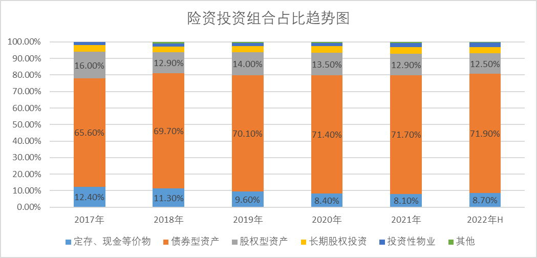 从趋势上看,平安过去5年多可变现金融资产货币资金及定存占比减少,与利率成正相关态势。股权投资减少近4pct,但是债券型投资增长超过6pct,长期股权投资变动幅度并不大,新增的长期股权投资较少,主要调整在于持币变为持债。
