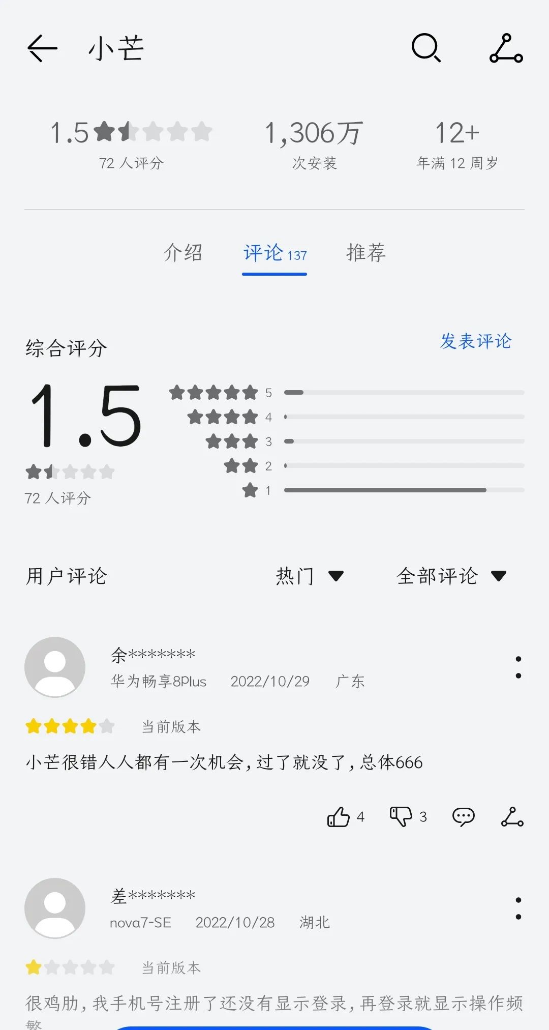 2021年,小芒电商上线,定位为新潮国货内容电商平台,旨在破解长视频变现难题。但这款应用上线至今,在华为的应用市场安装量仅1306万次,评分只有1.5,软件Bug、客服、物流等备受吐槽。