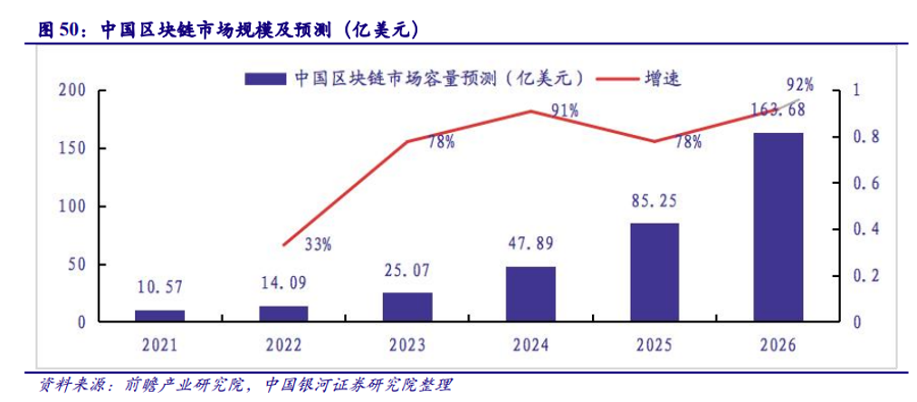 从市场规模来看,银行证券研报显示,2017年中国区块链行业市场规模在 0.85亿美元,2020年达到5.61 亿美元,年均复合增长率为87.58%。预计到2026年,我国区块链和新产品和解决方案及相关衍生产业的市场规模将达到百亿美元。
